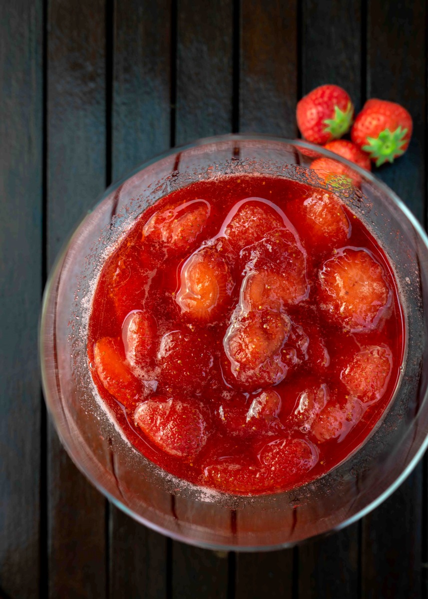 Laat de aardbeien ongeveer vijf minuten doorkoken. De aardbeien houden zo hun vorm. Zet het vuur uit en laat de aardbeien een klein beetje afkoelen.