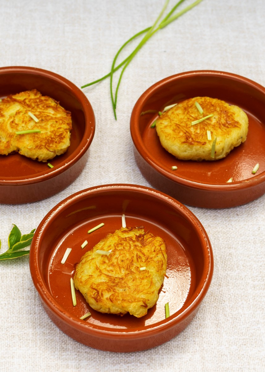 Druk de koekjes met de bakspatel een beetje plat in de pan. Bak de aardappelkoekjes mooi goudbruin, keer ze om en bak ook de andere kant mooi bruin en gaar. Haal de aardappelkoekjes uit de pan en laat ze uitlekken op een bord met keukenpapier.